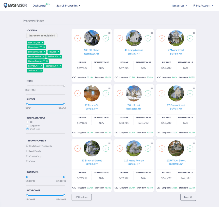 Mashvisor’s Property Finder lets you search, compare, and analyze properties for sale in up to 10 markets at once.