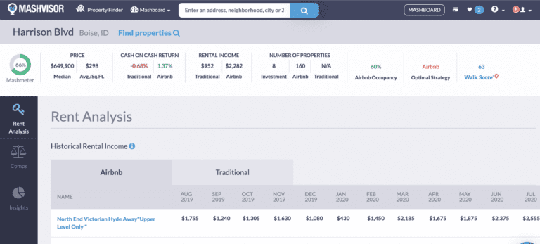 To get this kind of data on neighborhoods in the Boise real estate market, you can visit their Neighborhood Analytics page on Mashvisor. This is an in-depth real estate market report on a neighborhood where you get data on the average cash on cash return, Walk Score, historical rental income of local properties, real estate comps, and more.