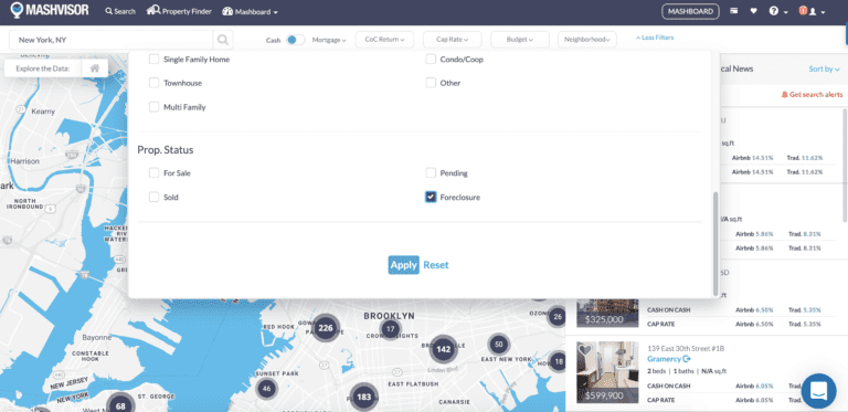 However, at this point, you’re seeing all of the New York City income properties for sale. You need to select the foreclosure search filter to narrow down your search. You’ll get access to this unique filter when you sign up for an Expert Plan with Mashvisor.