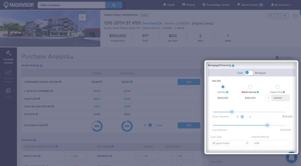 Aside from the price, the number of beds and baths, you can see the kind of other useful real estate investing information the investment calculator provides. It lets a real estate investor decide if the Airbnb rental strategy or traditional rental strategy is best by showing the rental income, cash flow, cash on cash return, cap rate, and occupancy rate for the investment property with each strategy.